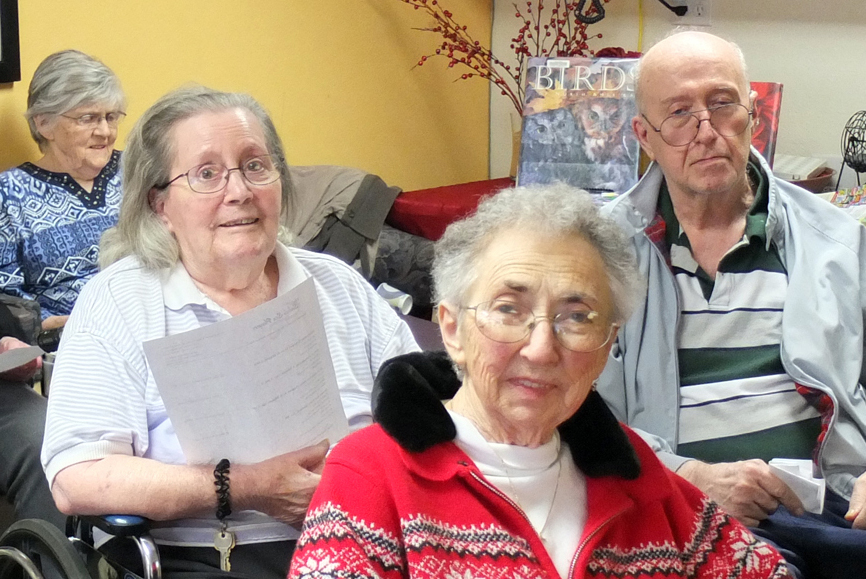 The concert at Foss Home today was in a somewhat smaller room than we are used to, and, despite a carpeted floor, the acoustic was delightfully warm and resonant. Most of the audience was in wheel chairs making it difficult for them to come up and talk with us, so after we played we went into the room and mingled a bit.